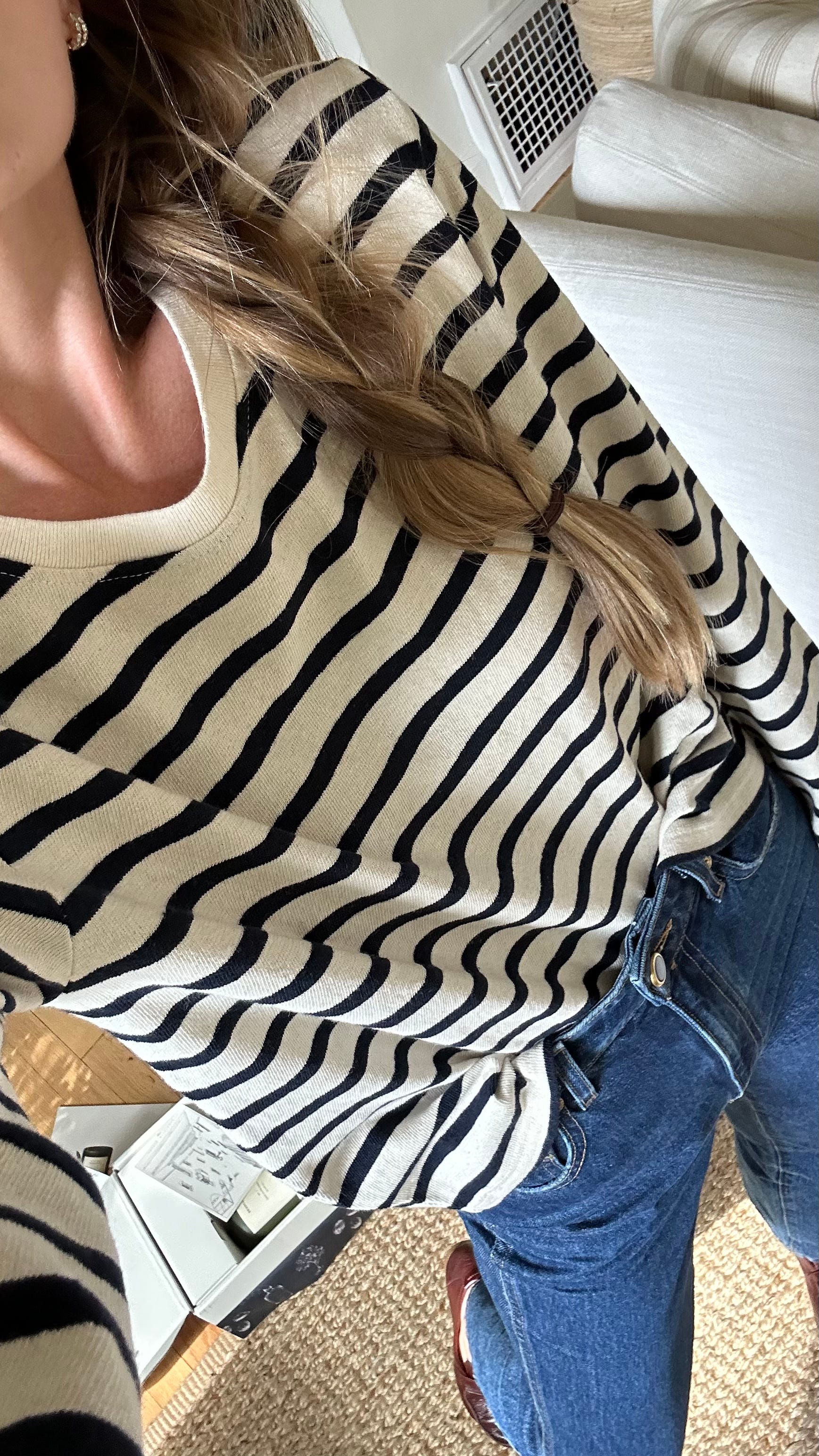 The second stripe is this substantial striped crew from Wyeth, created by my friend, Jacey Duprie (she’s also on Substack). When I saw this piece online, I thought it would be a simple cotton tee. Nope. It’s a knit tee, almost sweatshirt-like, with a heavier hand-feel. Love a little weight in a classic stipe crew for Fall. 10/10.