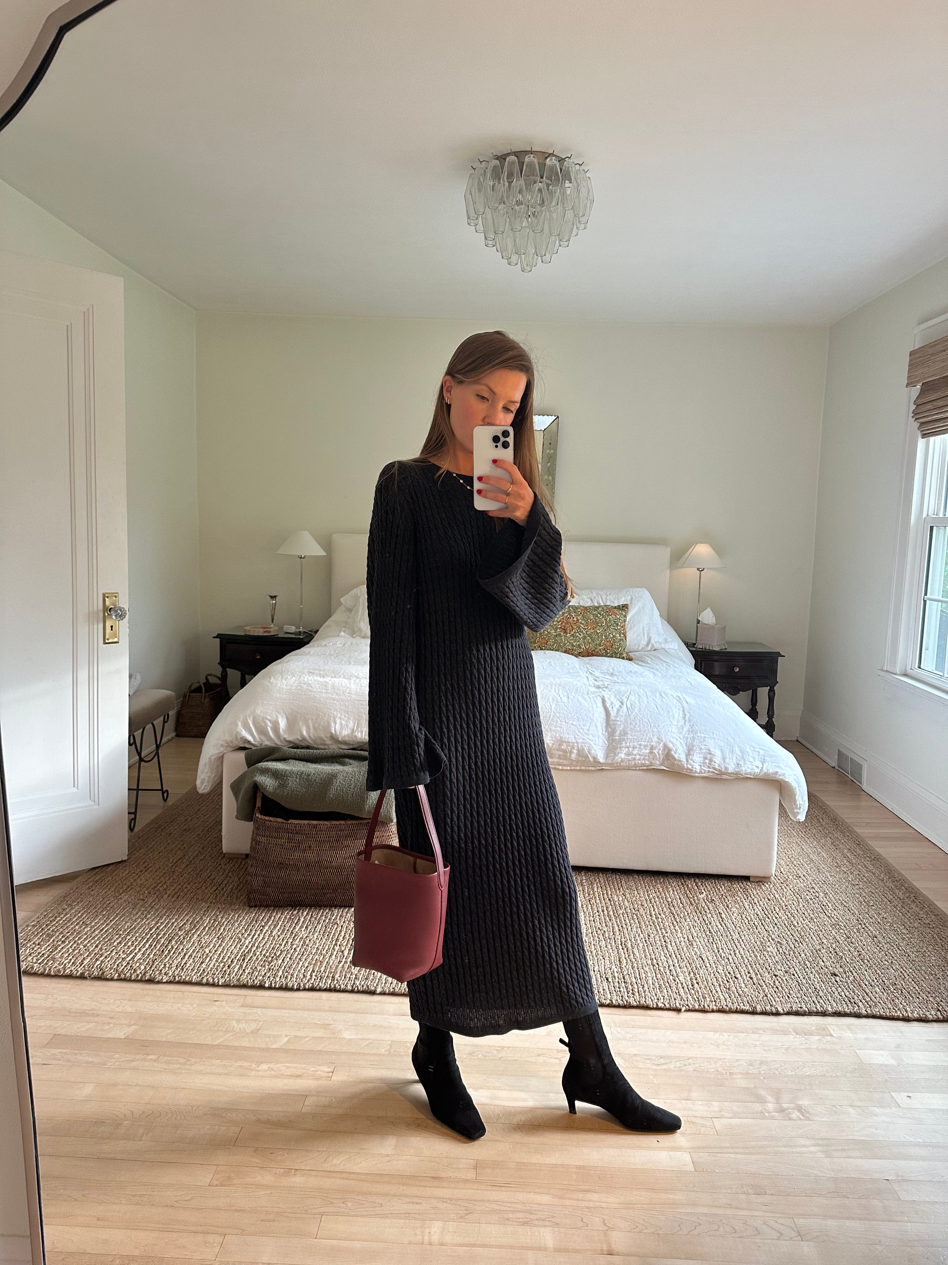 I pushed the limits with my Toteme wool cableknit dress, wearing it on a 70-degree day. My desire to wear this piece outweighed my desire to embrace our final Summer days, which says a lot. Toteme’s wool is just too good to pass on — it is ultra fine, almost silky-feeling. Zero percent itchy, and absolutely zero pilling.